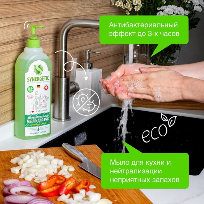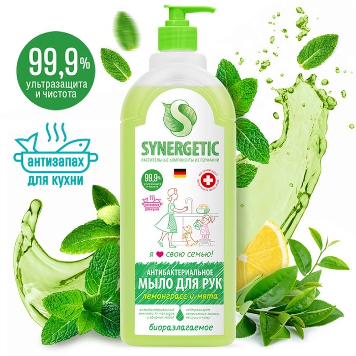 Мыло жидкое Synergetic «Лемонграсс и мята», гипоаллергенное, антибактериальное, 1 л