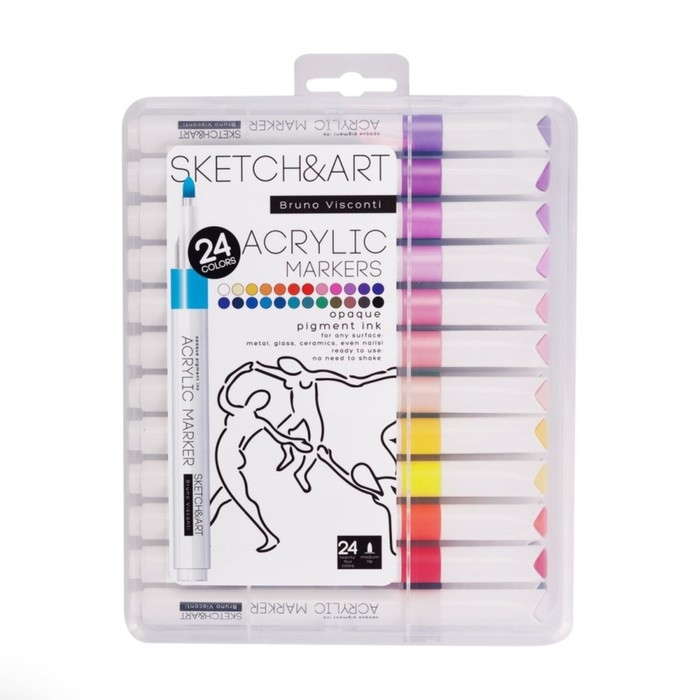 Набор из 24 акриловых маркеров «SKETCH&ART» различных цветов для рисования, декорирования, дизайнерских работ на любых поверхностях: холст, бумага, дерево, пластик, металл, камень, стекло, одежда, керамика.Корпус маркеров изготовлен из полипропилена - легкий и ударопрочный. Плотно защелкивающийся колпачок обеспечивает долгую сохранность чернил от высыхания.Маркер имеет пулевидный наконечник из износостойкого волокна с шириной линии 1-3 мм. Нетоксичные пигментные чернила на водной основе с высокой степенью укрывистости быстро сохнут на поверхности, оставляя яркий след. Краски до высыхания можно смешать или растушевать кистью для достижения плавных переходов.Маркеры упакованы в картонную упаковку с эффектом Soft Touch и узнаваемым дизайном всей линейки «Sketch&Art». Размер: 149 x 180 x 35 мм.
