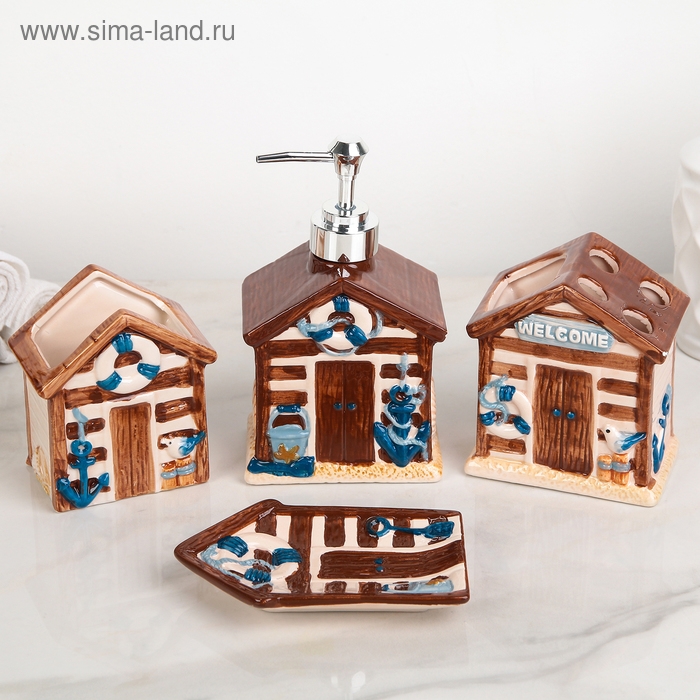 Набор аксессуаров для ванной комнаты Доляна «Маяк», 4 предмета (дозатор 400 мл, мыльница, 2 стакана), цвет коричневый