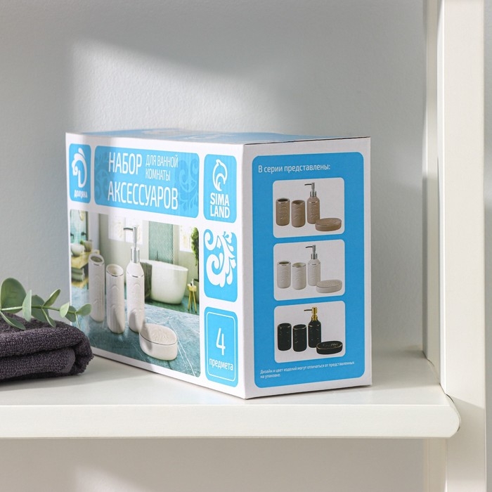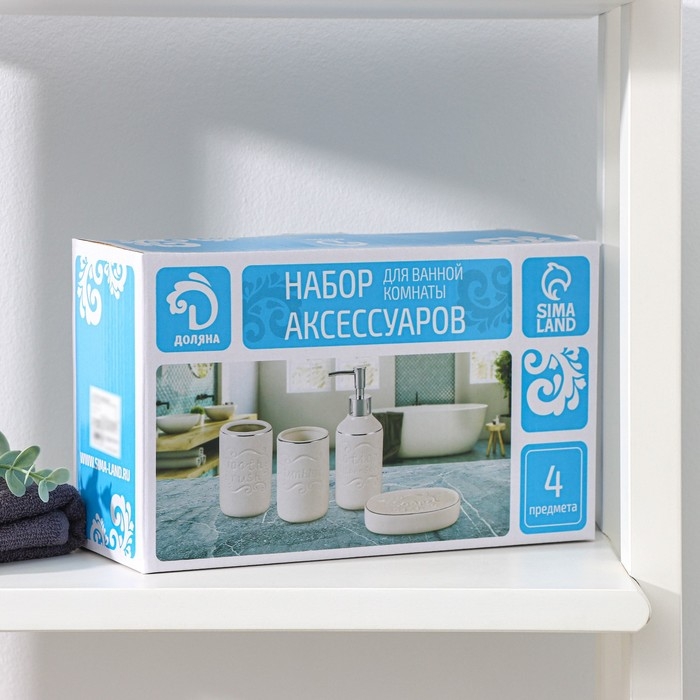 Набор аксессуаров для ванной комнаты Доляна «Изящный барельеф», 4 предмета (дозатор 250 мл, мыльница, 2 стакана), цвет белый