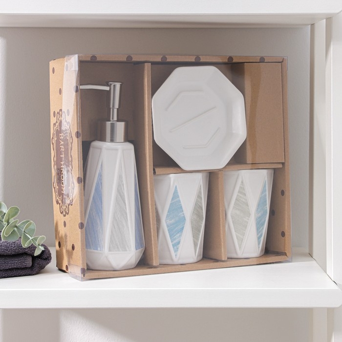 Набор аксессуаров для ванной комнаты Доляна «Изящество», 4 предмета (дозатор 250 мл, мыльница, 2 стакана), цвет белый