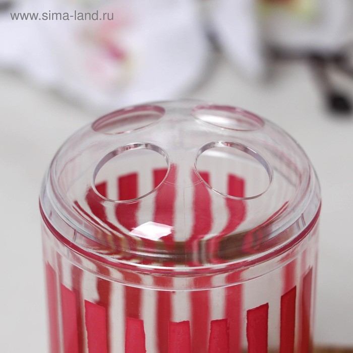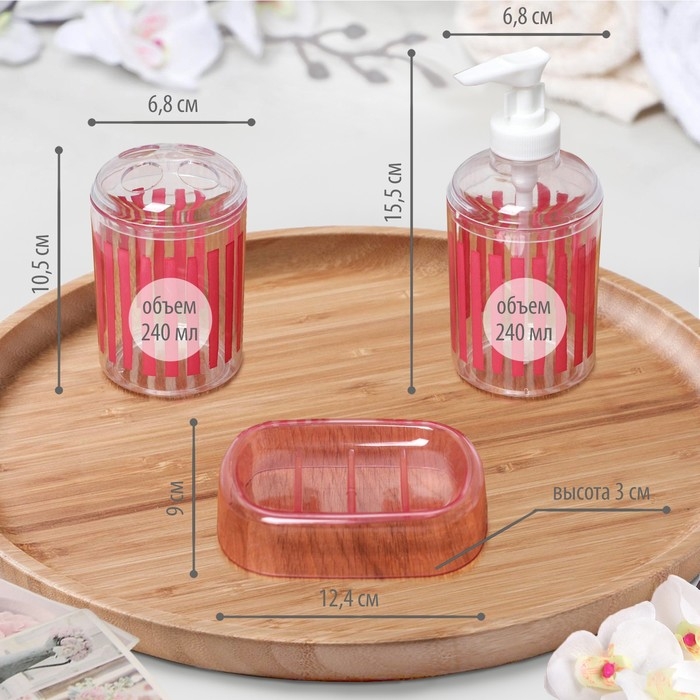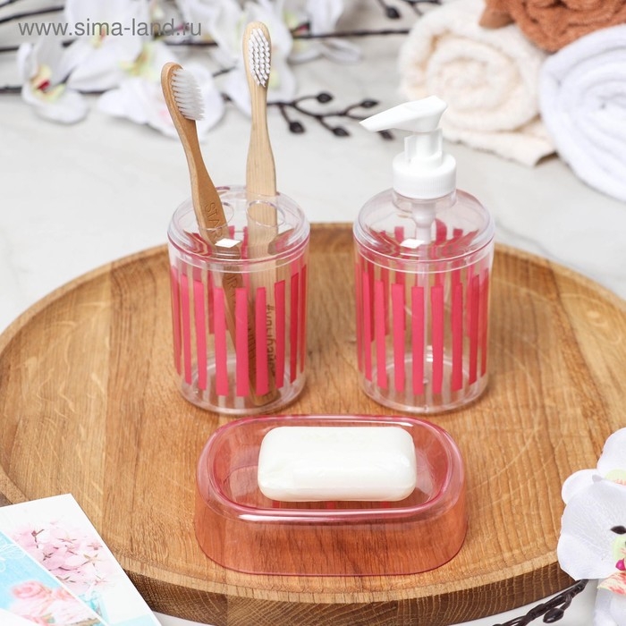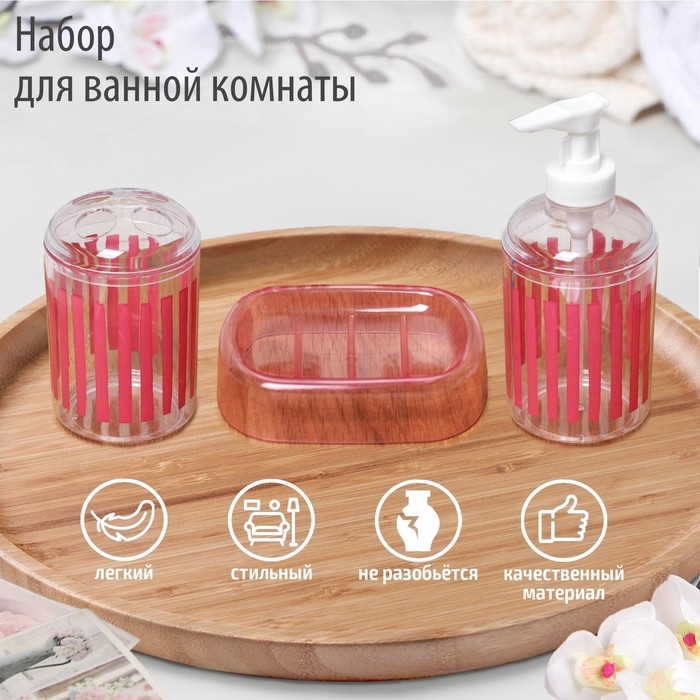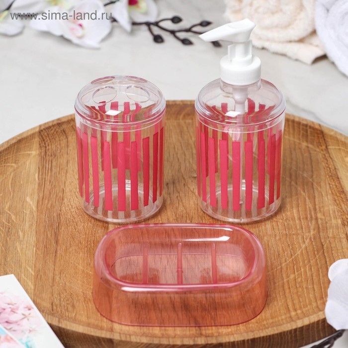 Набор аксессуаров для ванной комнаты «Полоски», 3 предмета (мыльница, дозатор для мыла, стакан), цвет красный