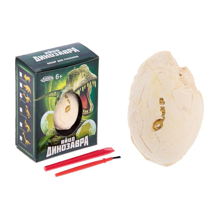 В наборе: долото, кисточка, окаменелое яйцо с кладом внутри.