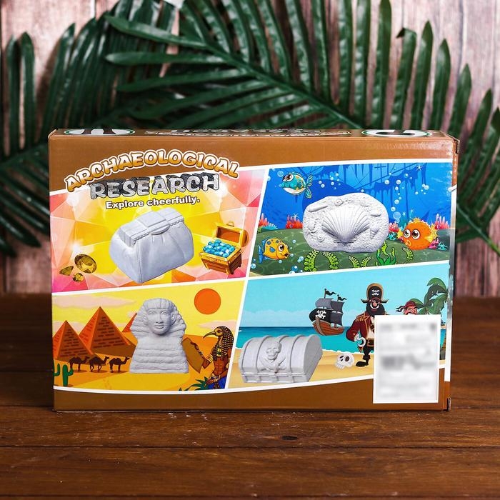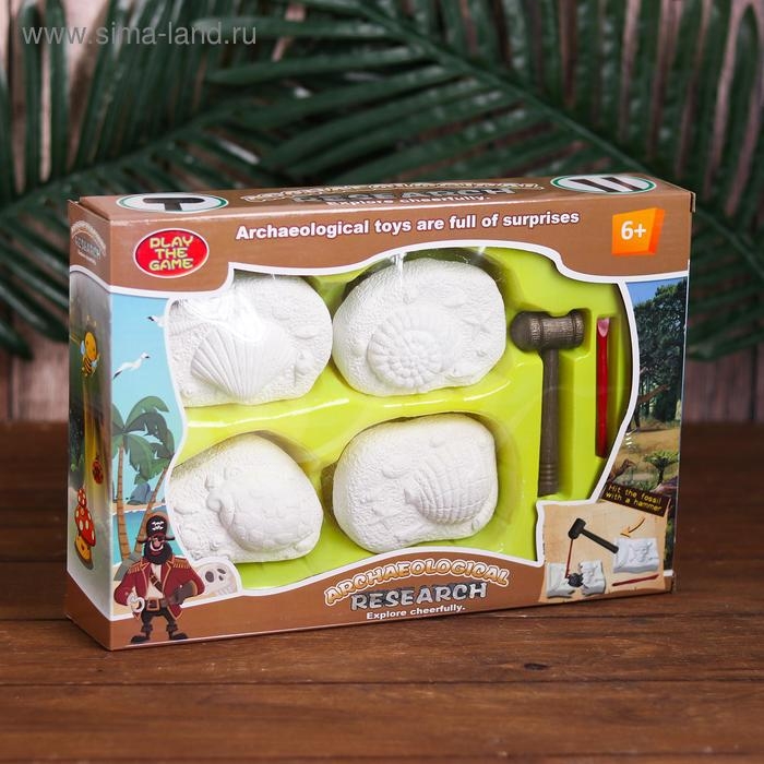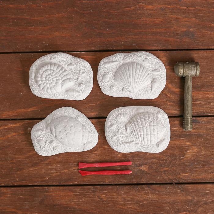 В наборе: долото, молоток, 4 гипсовых объекта с кладом внутри.