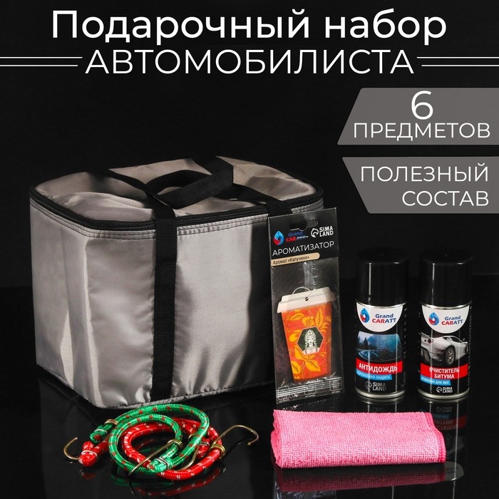 Набор автомобилиста подарочный Grand Caratt в термосумке включает в себя 6 необходимых предметов для каждого водителя. Стильный и компактный дизайн делает его отличным выбором для подарка.