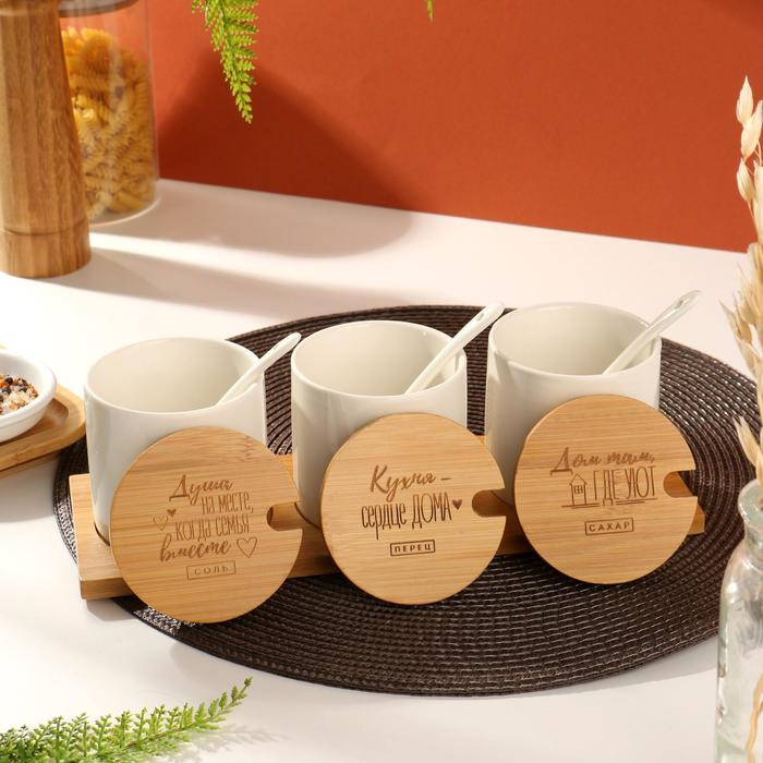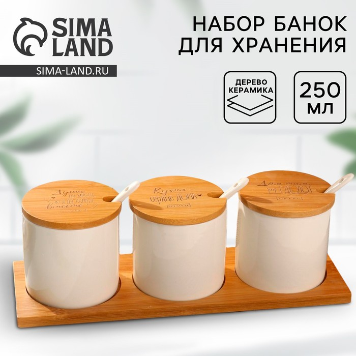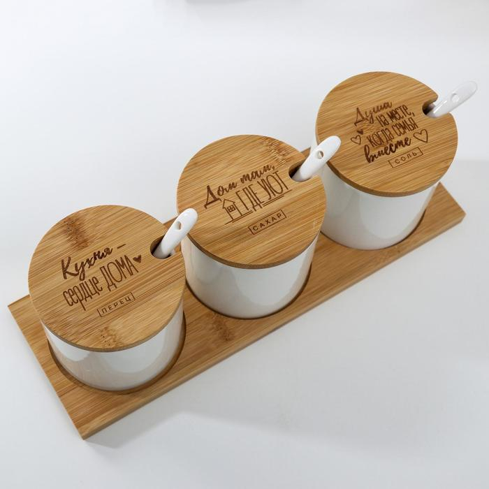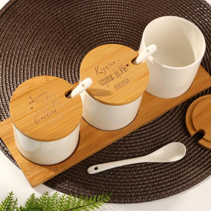 Набор банок керамических для хранения на деревянной подставке «Кухня - сердце дома», 3 шт, 250 мл, цвет белый