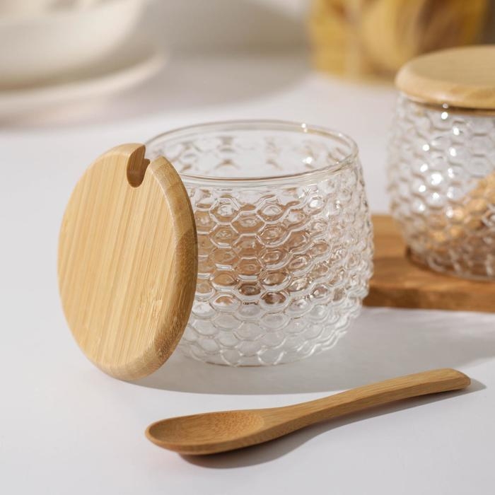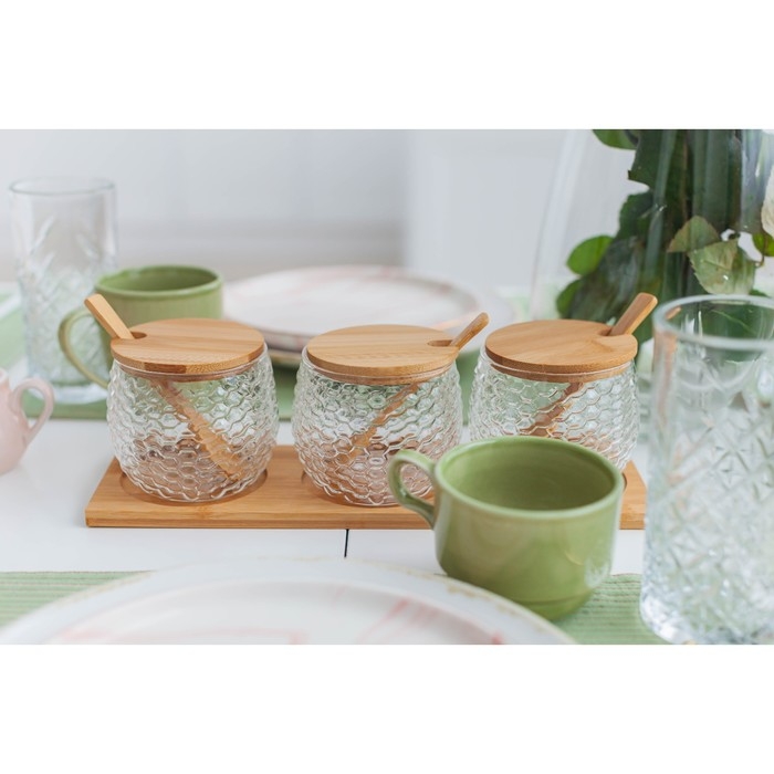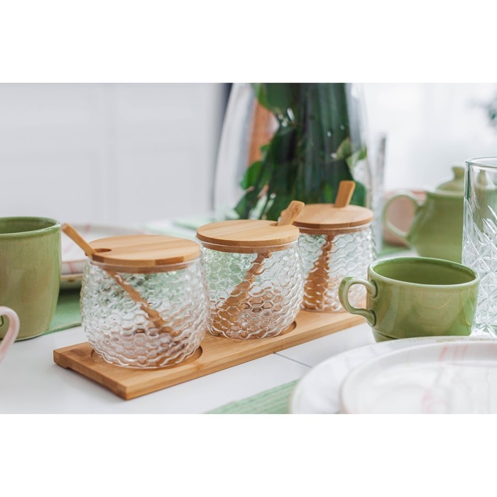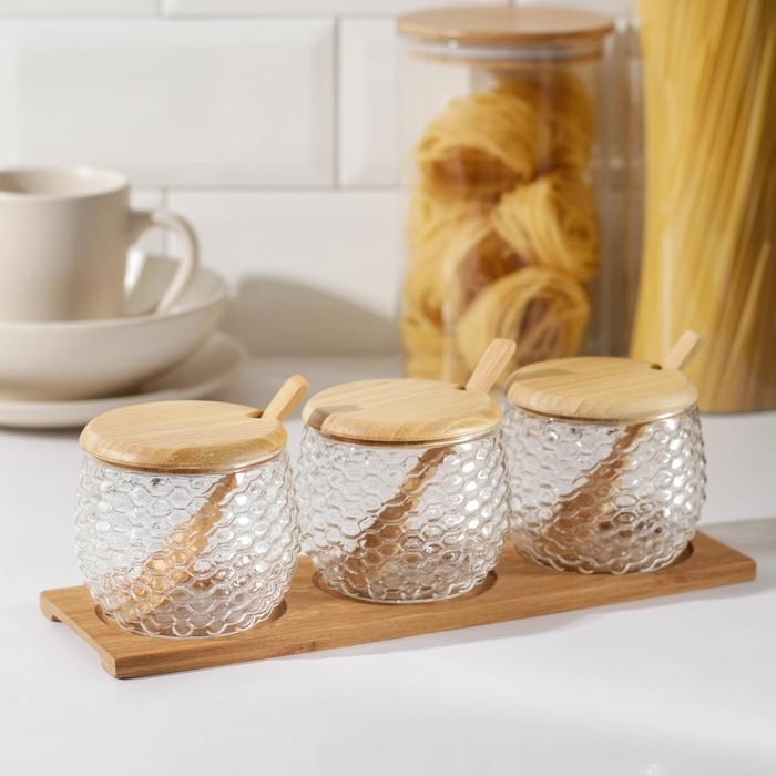 Набор банок стеклянных для сыпучих продуктов на деревянной подставке «Эко», 300 мл, с ложками, 3 шт
