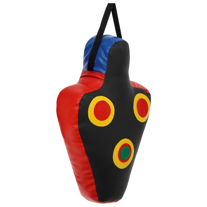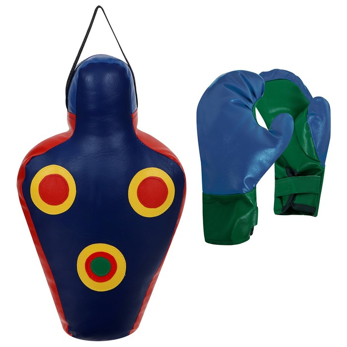 Груша имеет форму, похожую на человеческое тело. На ней есть мишени для точного попадания по конкретным участкам. Перчатки защищают кисти рук от травм при отработке ударной техники.