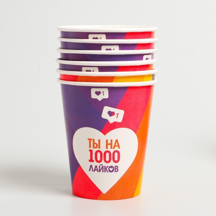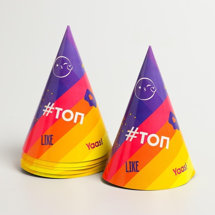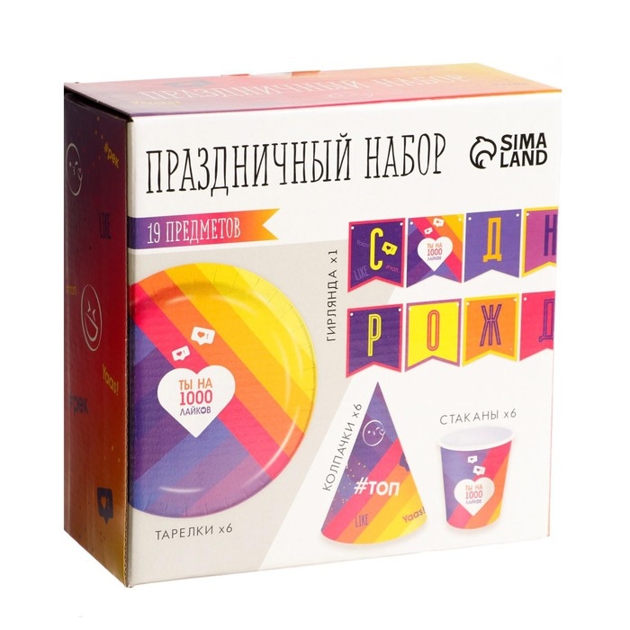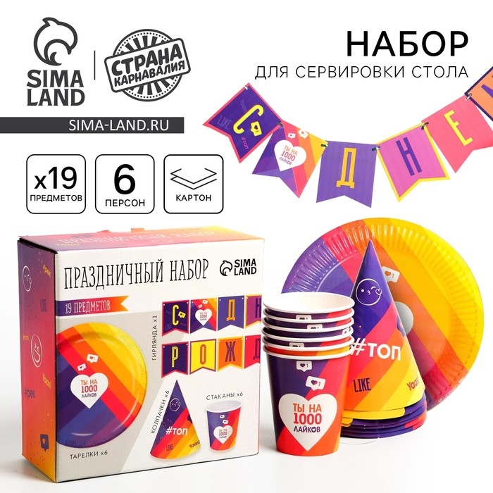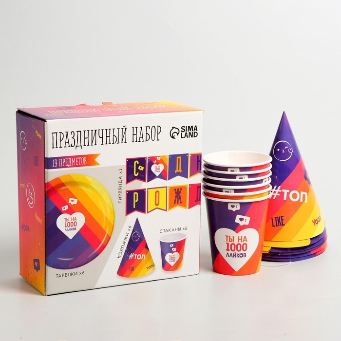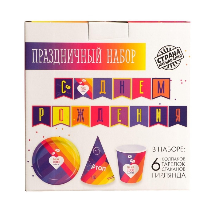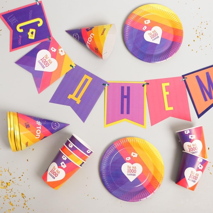 Набор бумажной посуды одноразовый Лайк», 6 тарелок, 6 стаканов, 6 колпаков, 1 гирлянда