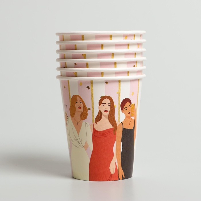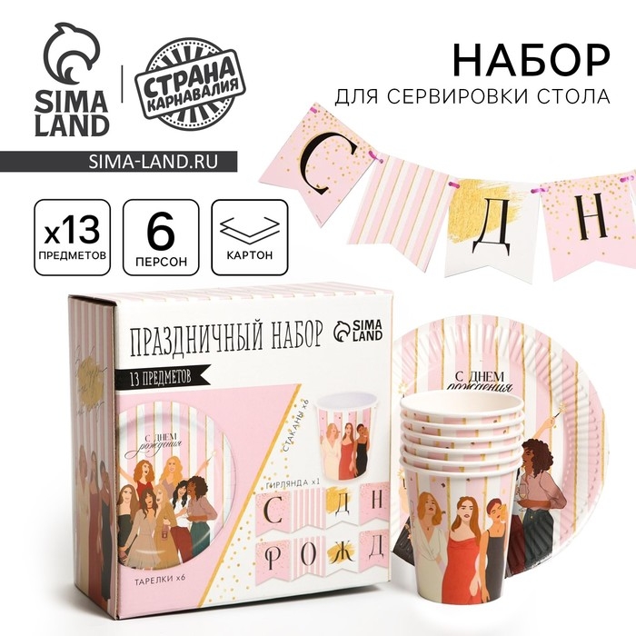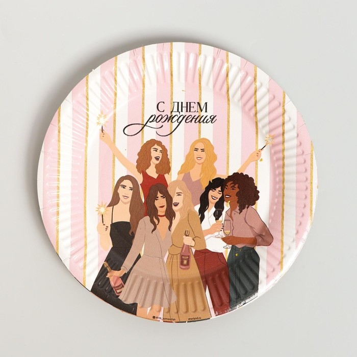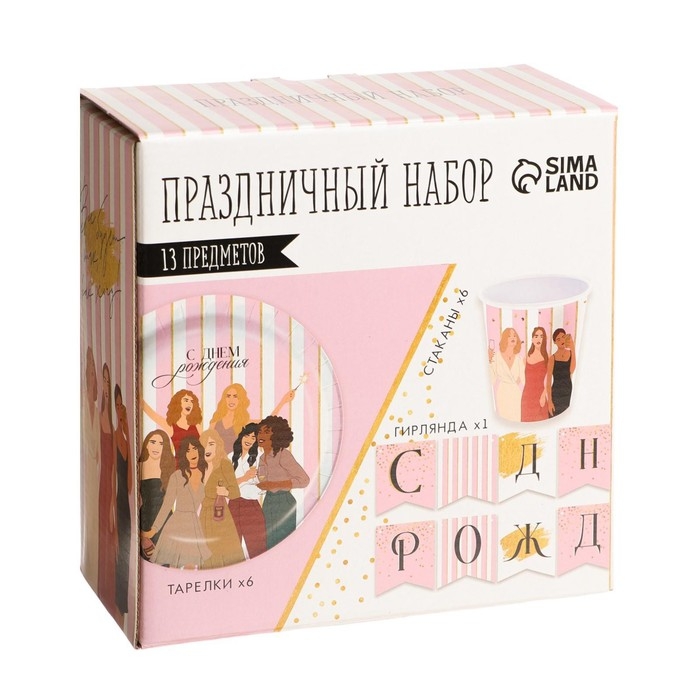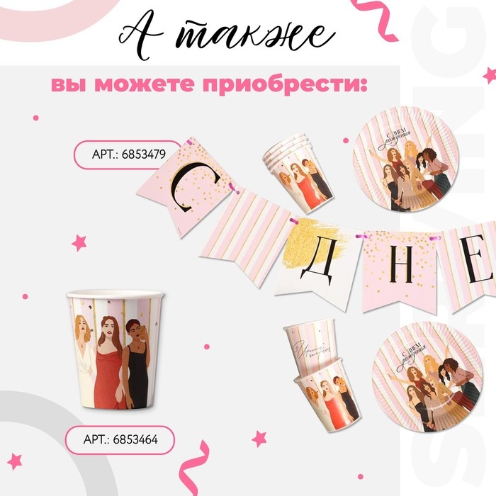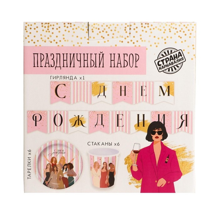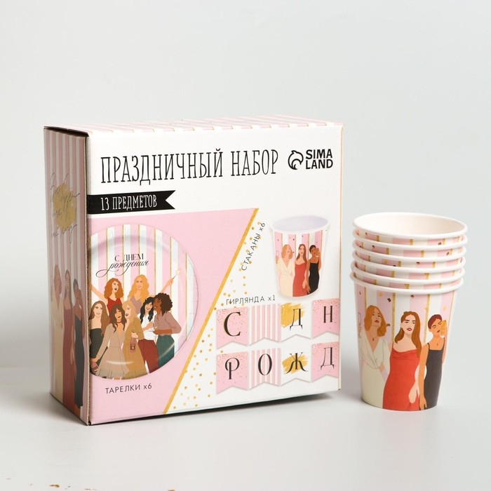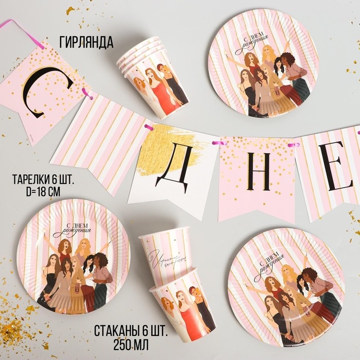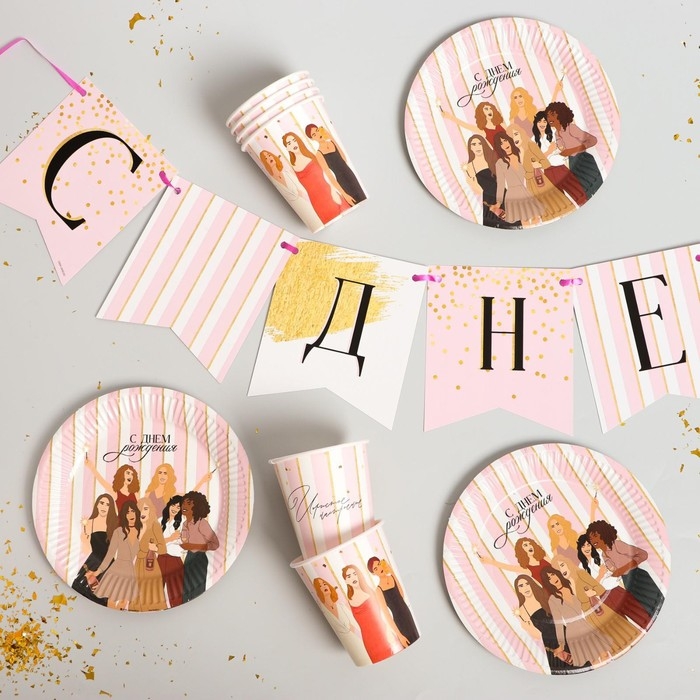 Набор бумажной посуды одноразовый С днём рождения, красотка», 6 тарелок, 6 стаканов, 1 гирлянда