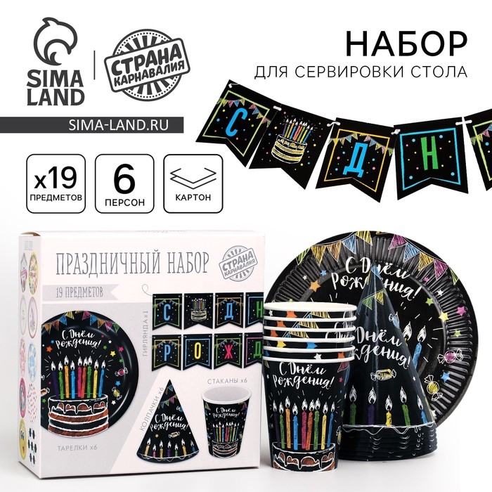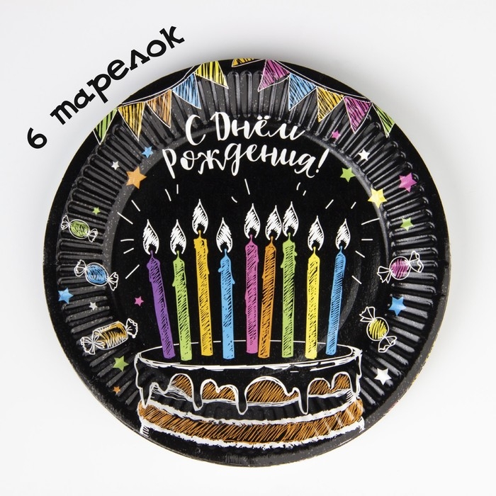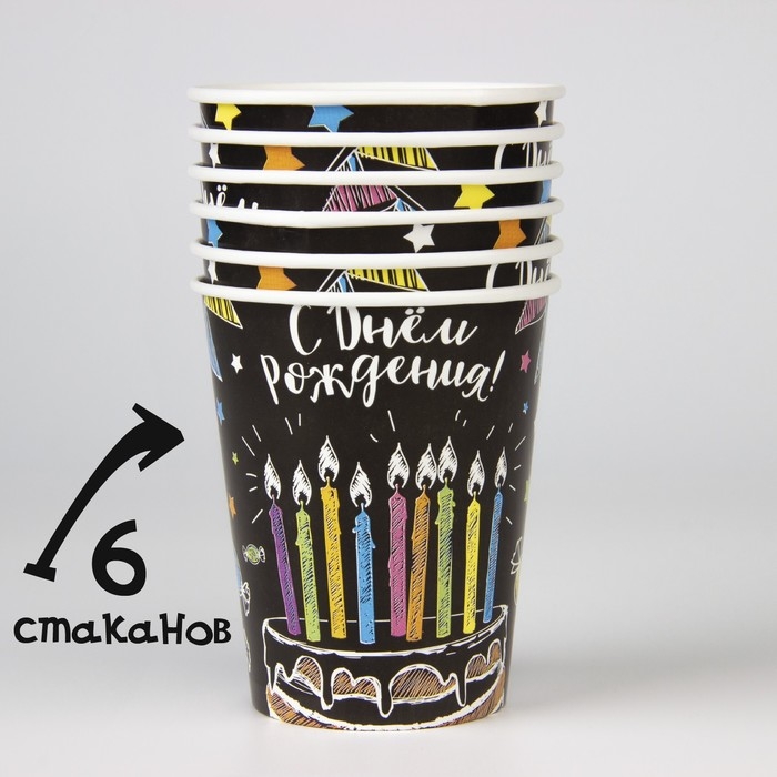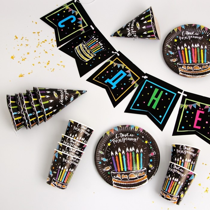 Набор бумажной посуды одноразовый С днём рождения», мелом 6 тарелок , 1 гирлянда , 6 стаканов, 6 колпаков