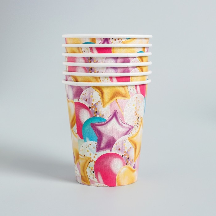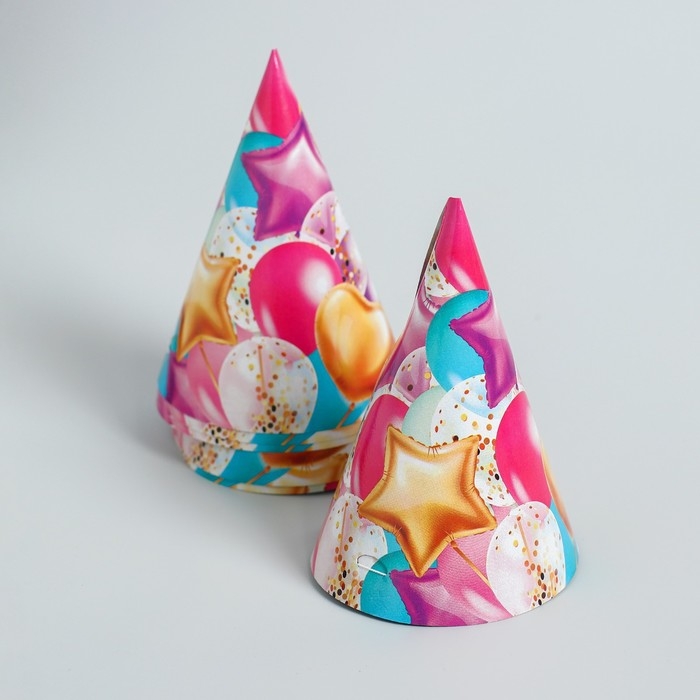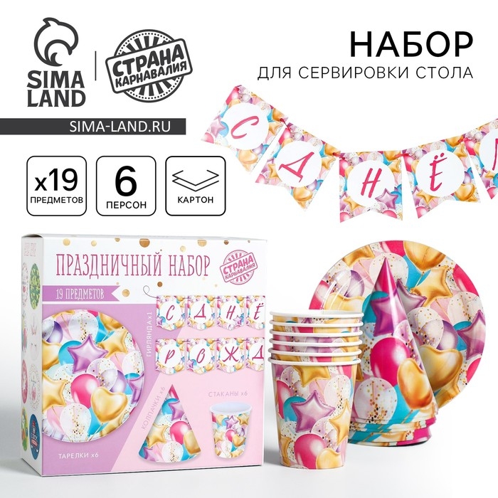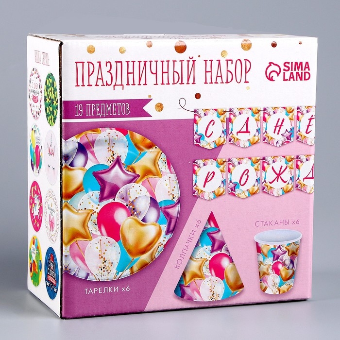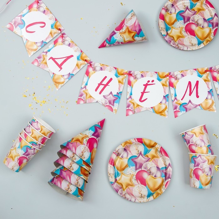 Набор бумажной посуды одноразовый С днём рождения. Шары», 6 тарелок, 6 стаканов, 6 колпаков, 1 гирлянда
