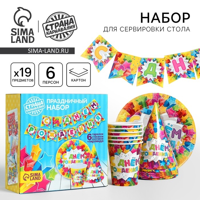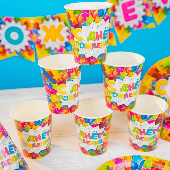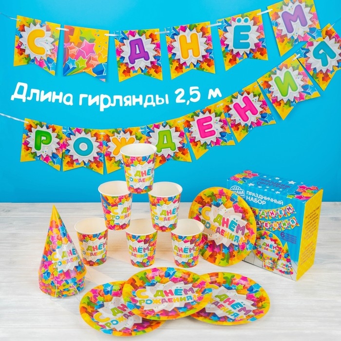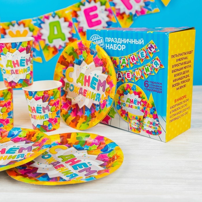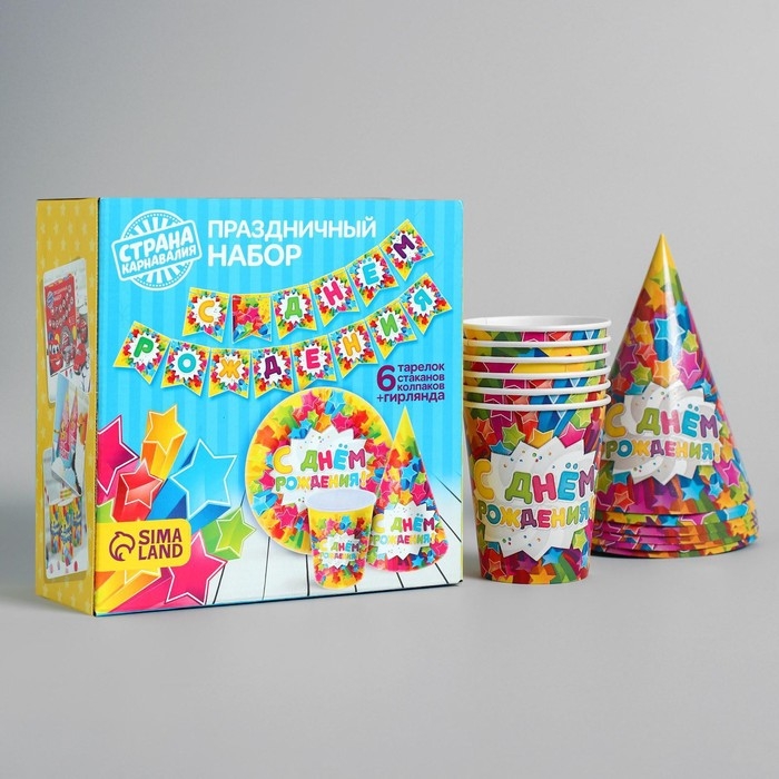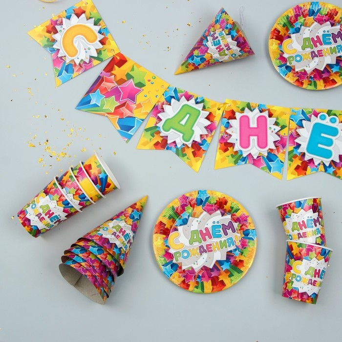 Набор бумажной посуды одноразовый С днём рождения. Яркие звёзды»: 6 тарелок, 6 стаканов, 6 колпаков, 1 гирлянда
