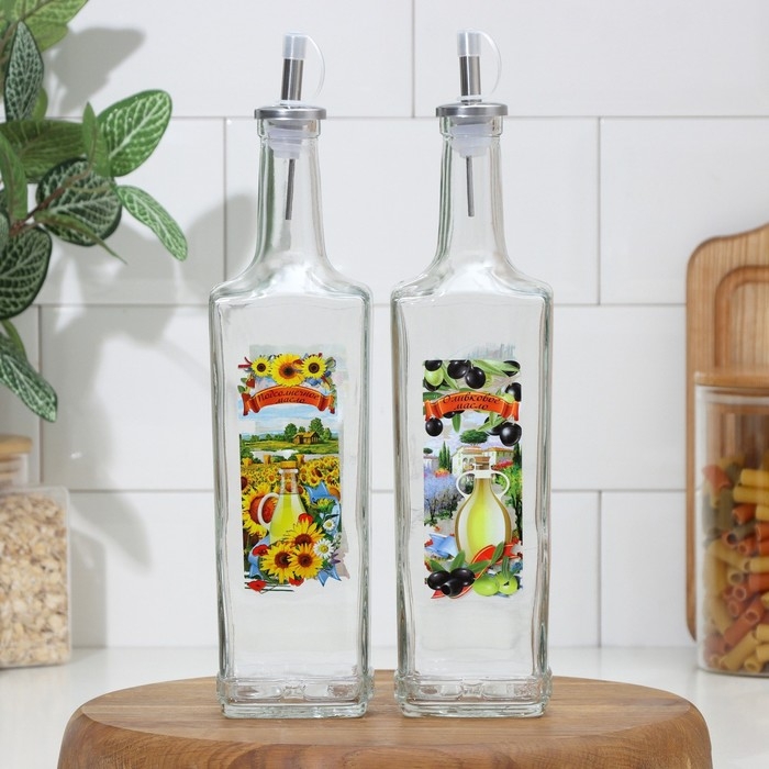 Бутылка для масла, уксуса, различных соусов и маринадов, набор из 2 штук. Бутылки изготовлены из качественного стекла, герметичные крышки-дозаторы позволяют сохранять вкусы и запахи долгое время. Изделие предназначено для хранения и использования различных растительных масел, уксусов и соусов. Емкость для масла и уксуса многоразовая и экологичная. Объём одной бутылки - 500 мл.