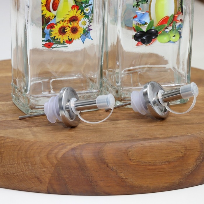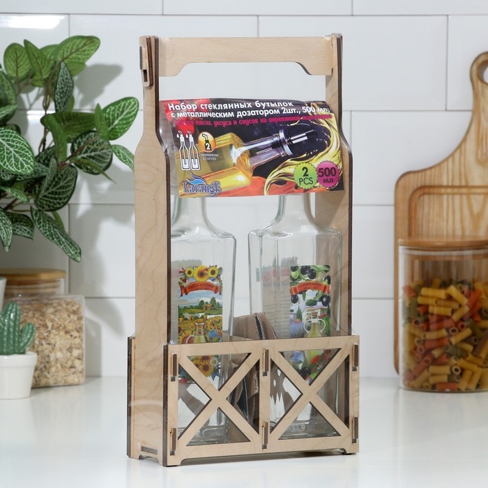 Набор бутылок с металлическим дозатором для масла и соусов, стеклянный, 500 мл, 2 шт, на деревянной подставке