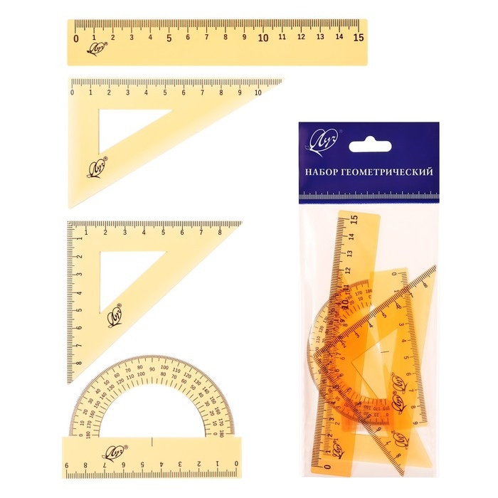 Предметы из набора (Линейка, два угольника, транспортир), предназначены чтобы: - заниматься построением геометрических фигур, - чертить углы и прямые линии с помощью треугольника и линейки, - измерять сантиметровой линейкой длину и ширину, - определять транспортиром точный угол наклона.В наборе: Линейка 15 см, угольник 30 °/ 60 °, 10 см; угольник 45 °/ 45 °, 8 см; транспортир 180 °, 9 см