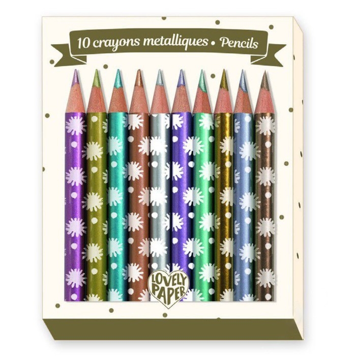 Цветные карандаши из новой серии канцелярских товаров Lovely Paper от французского производителя Djeco непременно обрадуют маленьких художников и прекрасно помогут украсить рисунки необычными цветами. В наборе малыш найдёт 10 мини-карандашей цвета металлик. Красивые цвета и великолепное европейское качество приведут в восторг не только начинающих художников, но и опытных ценителей искусства. Рисунки, созданные с помощью карандашей металлик красиво переливаются блеском, не выцветают и сохраняют насыщенность цвета в течение долгого времени.