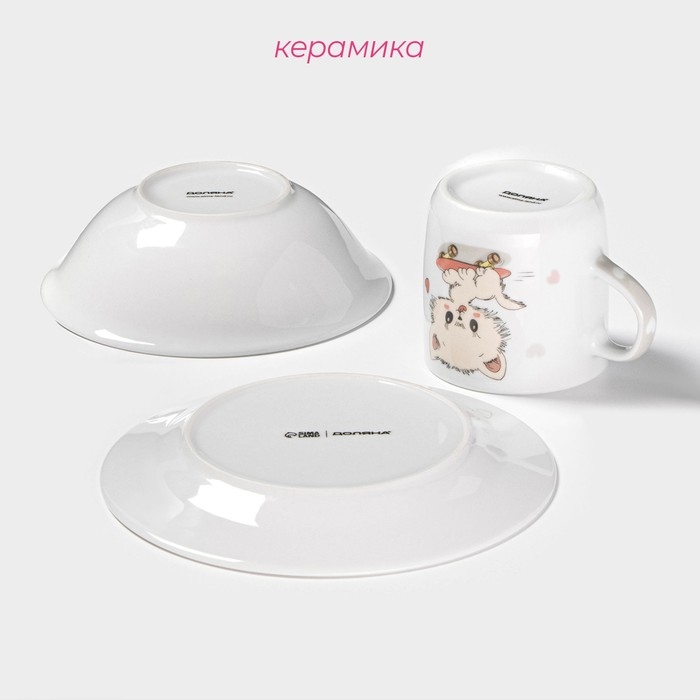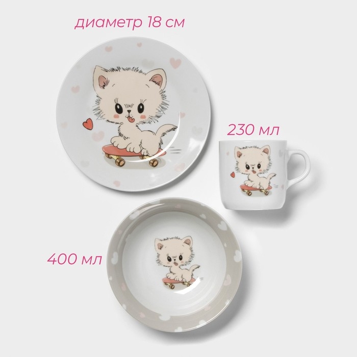 Набор детской посуды Доляна «Котёнок на скейте», 3 предмета: кружка 230 мл, миска 400 мл, тарелка d=18 см