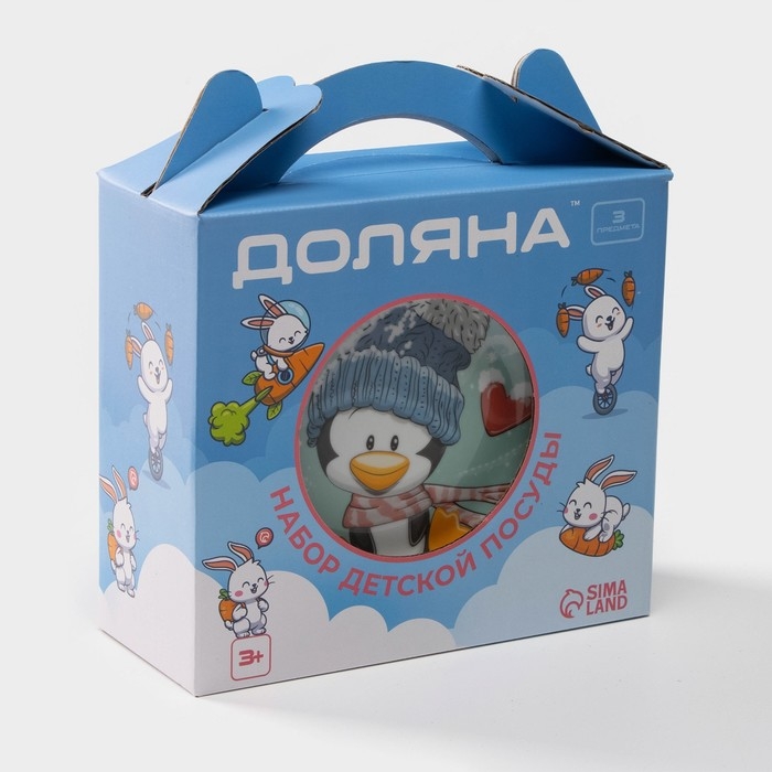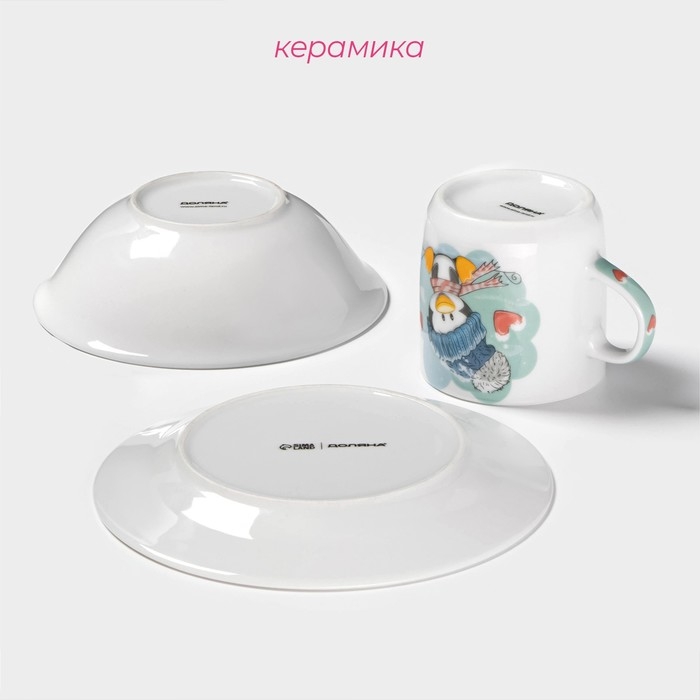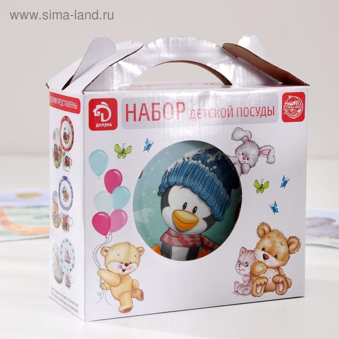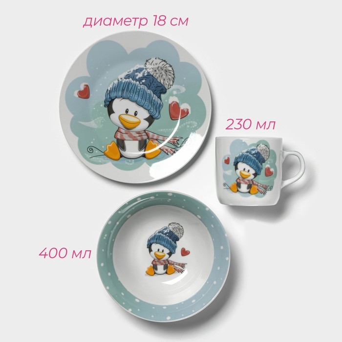 Набор детской посуды Доляна «Пингвинёнок», 3 предмета: кружка 230 мл, миска 400 мл, тарелка d=18 см, цвет белый