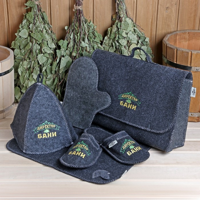 Набор для бани 5 предметов (портфель, шапка, тапочки "Директор бани", варежка, коврик) серый