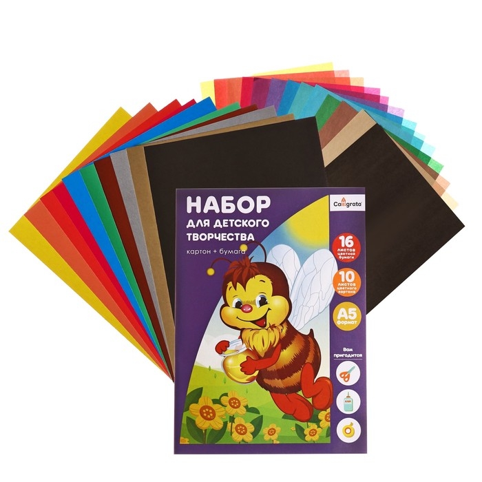 Набор для детского творчества А5, 10 листов картон цветной мелованный + 16 листов двусторонняя бумага цветная