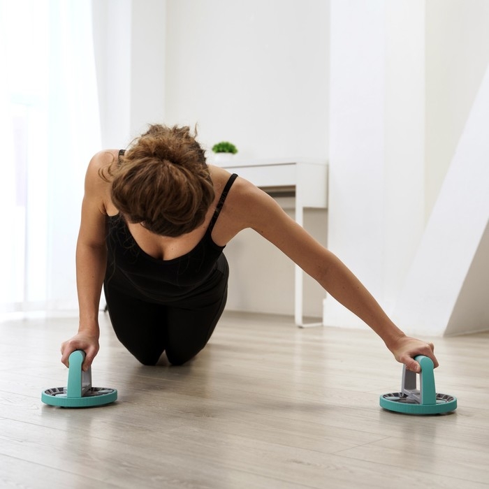 Набор подходит для домашних тренировок. В комплектацию входят упоры для отжимания, ролик, эспандер.