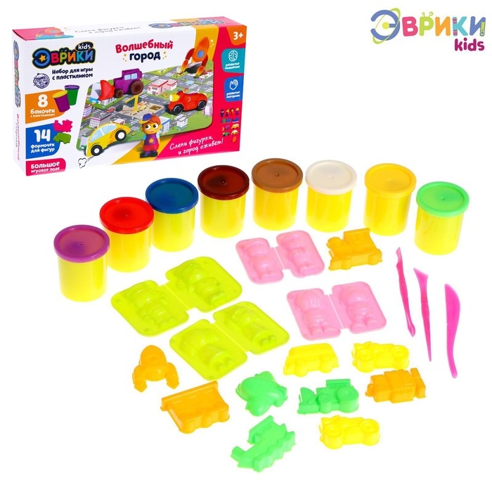 Набор для творчества «Волшебный город» — это комплект разнообразных предметов для лепки из пластилина. В нём можно найти несколько интересных инструментов и формочек, а также баночек с разноцветной массой для лепки.