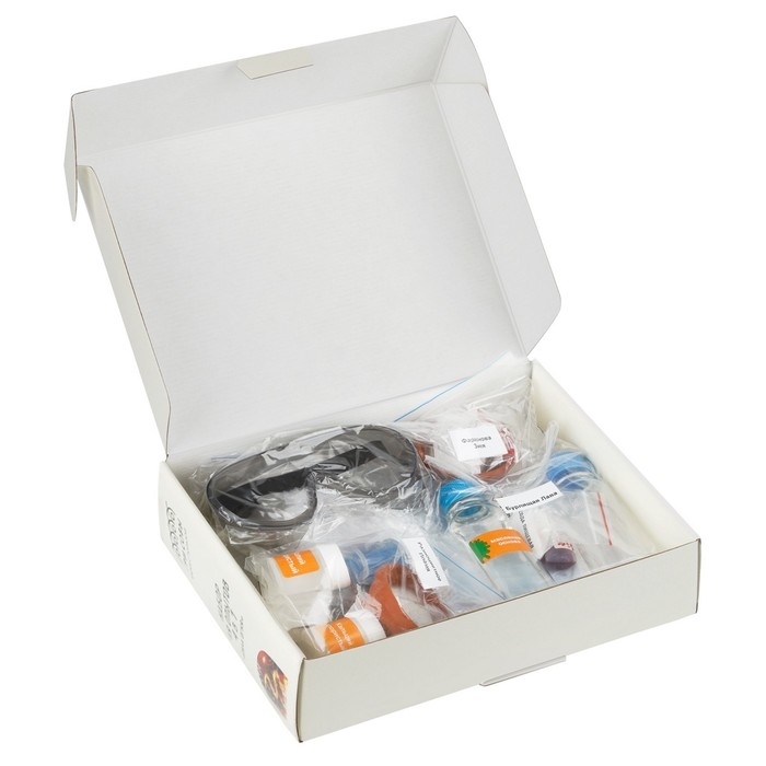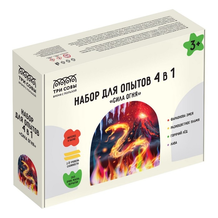 В наборе представлены 4 увлекательных опыта: фараонова змея, разноцветное пламя, горячий лед, лава.