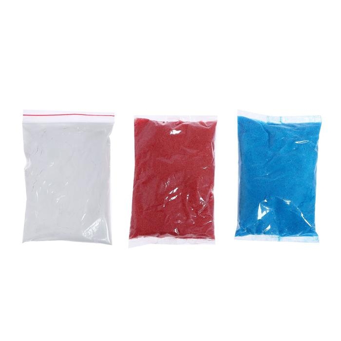 - Вместе с ребёнком насыпьте в мерный стакан гипс до отметки 40 мл, затем цветной порошок до отметки 60 мл. Тщательно перемешайте порошки с помощью палочки.