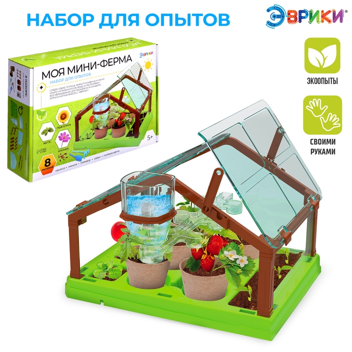 Набор для опытов «Моя мини-ферма» поможет погрузиться в удивительный мир природы. Ребёнок проведёт увлекательный эксперимент и узнает много интересного о том, как проращивать и сажать семена, выращивать растения, и как ухаживать за ними.
