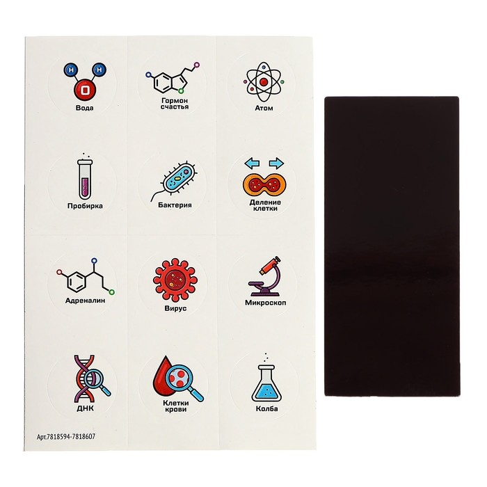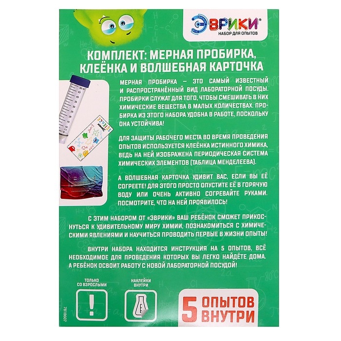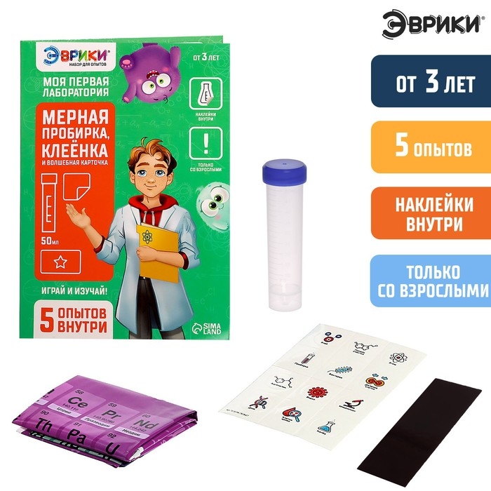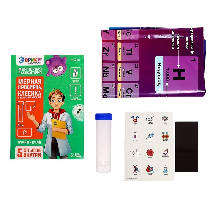 - Набор содержит инструкцию с подробным описанием к 5 экспериментам, мерную пробирку, клеёнку с таблицей Менделеева, термокарточку и тематические наклейки.