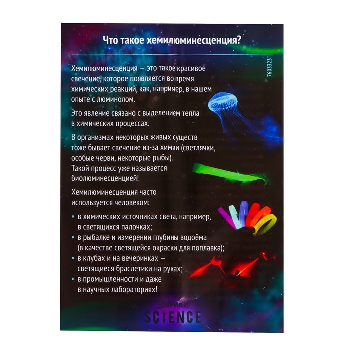 Хемилюминесценция — красивое свечение, которое проявляется во время химических реакций. Ребёнок узнает, какое вещество нужно для такой реакции, какие насекомые и животные обладают биолюминесценцией и где используется хемилюминесценция.