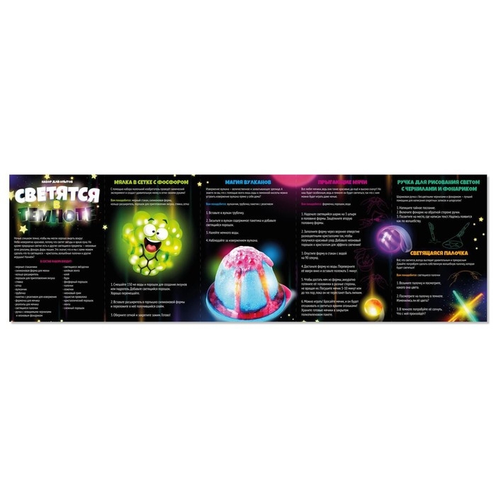 С набором для опытов «Эврики» ребёнок узнает о удивительных свойствах химии, проведёт 10 увлекательных светящихся экспериментов дома и удивит своих друзей. Наука — совсем не сложно, а занимательно и весело, если изучать её правильно!