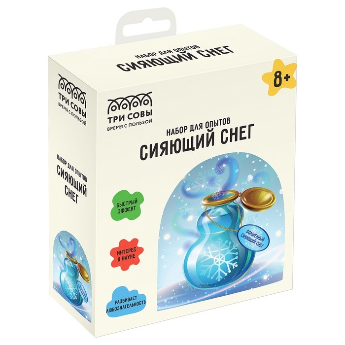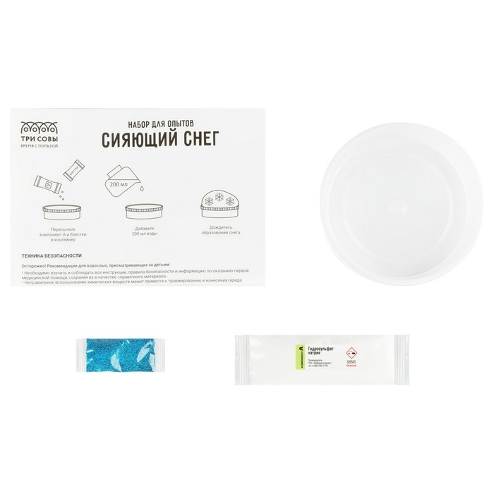 Набор для проведения опытов «Искусственный сияющий снег» — набор станет настоящим открытием для любознательных детей от 8 лет, позволит им самостоятельно провести первые научные эксперименты дома и узнать множество нового о химических и физических законах.