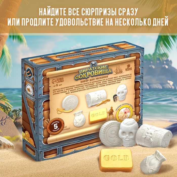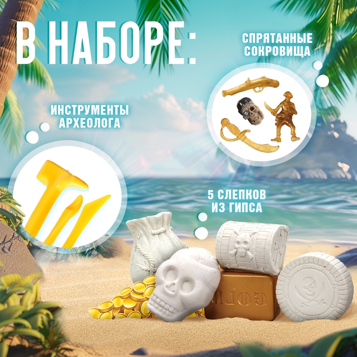 Пираты тысячелетиями находили золото и закапывали его по всему миру. Набор для раскопок позволит ребёнку почувствовать себя настоящим археологом, который разыскивает пиратские сокровища с помощью специальных инструментов. Желаем успехов в поисках загадочного клада!