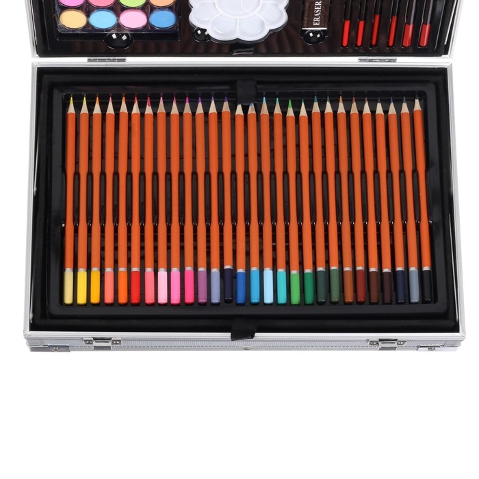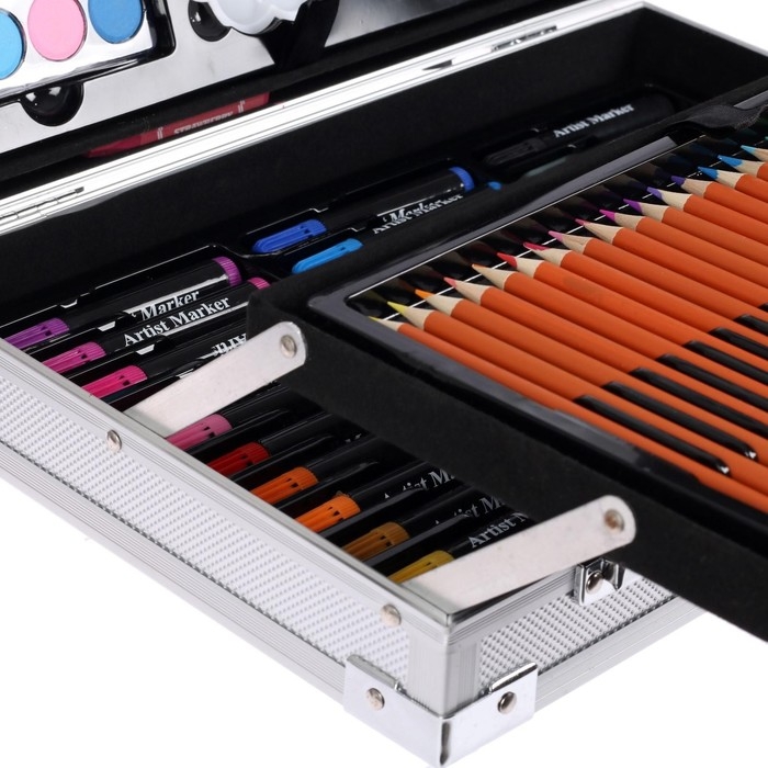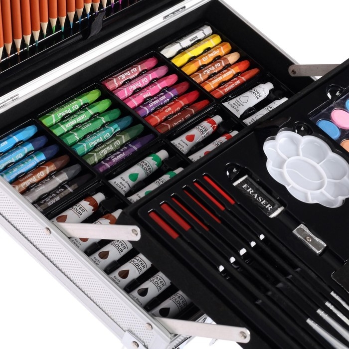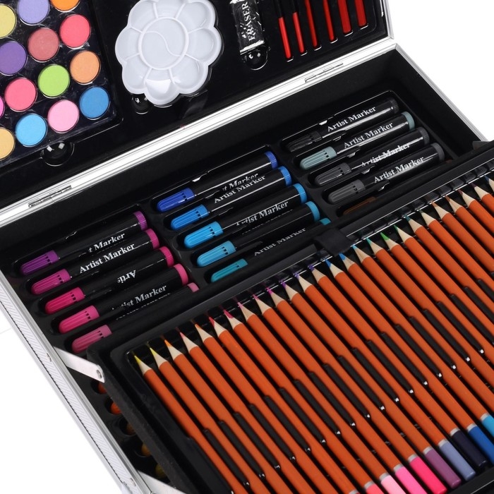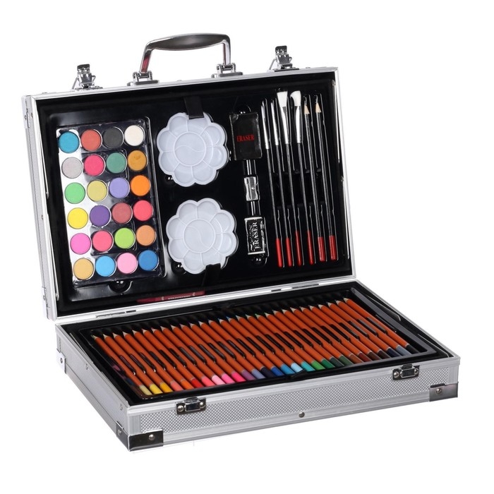 Набор содержит: Широкий ассортимент цветных карандашей, цветные фломастеры, пастель, акриловые краски, акварель, 2 простых карандаша и 4 кисти разной формы и размера. В наборе есть разнообразные канцтовары для удобной и практичной работы: Ластик и ластик клячка, точилка и 2 палитры. Набор подойдёт для разных художественных работ, от живописи до скетчинга. Удобный раскладной портфель, можно носить набор на учёбу, или на выезд. металлическая оболочка продлит срок жизни набора. Отличный выбор для опытного художника.