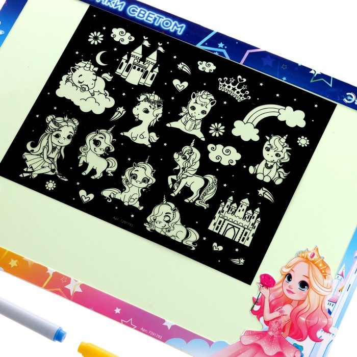 С набором «Принцессы» ребёнок научится рисовать не только простым маркером, но и светом! Малыш будет создавать картинки, используя трафареты, или придумает собственные сюжеты.