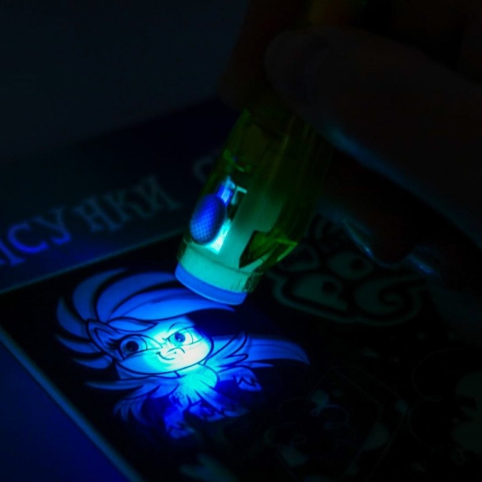 У волшебной ручки есть ещё одна функция — невидимые чернила. Снимите колпачок и напишите что-нибудь на листе бумаги, а затем посветите на надпись фонариком. Рисунок проявится.