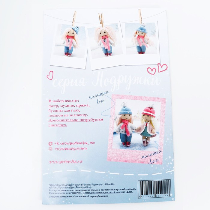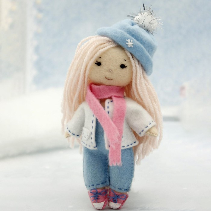 С набором для шитья из фетра у вас получится своими руками создать мягкую игрушку в виде милой девочки Сью в зимнем наряде, которая украсит интерьер вашего дома. Внутри набора вы найдёте необходимые материалы и инструкцию, в которой подробно написано, как сделать игрушку.