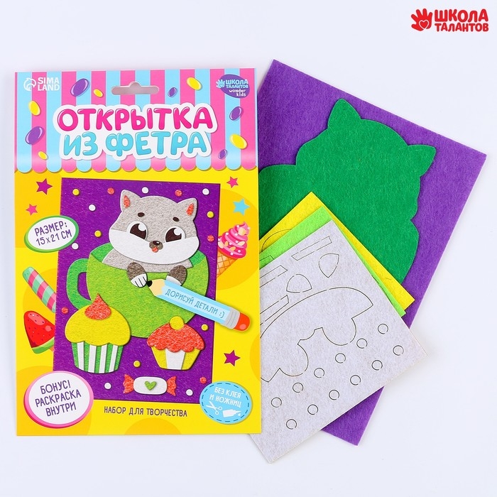 Детям нравится создавать поделки из самых невероятных материалов. Оригинальный набор для создания фетровой открытки по-настоящему увлечёт ребёнка и станет удачным подарком для талантливого малыша! Теперь вам не нужно вырезать детали вручную, просто отделите защитную пленку и приклейте их на нужное место.
