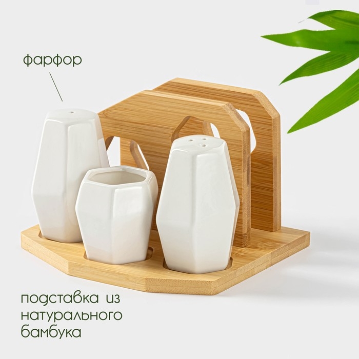 Набор фарфоровый для специй на бамбуковой подставке BellaTenero «Листья», 4 предмета: солонка 120 мл, перечница 120 мл, салфетница, подставка, цвет белый