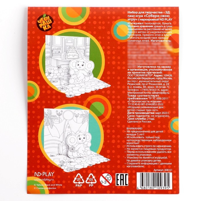 Набор для творчества - 3Д пазл игра, раскраска «Собери свою игру» «Чебурашка»