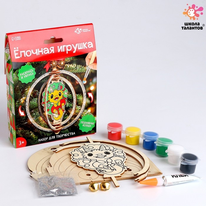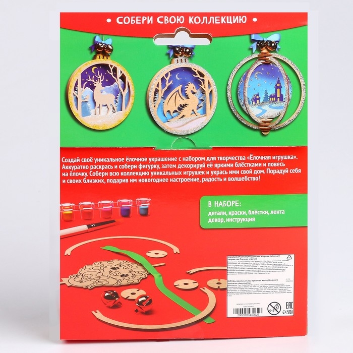 С набором для творчества ребёнок создаст яркую ёлочную игрушку своими руками. Малышу предстоит раскрасить деревянные заготовки и собрать их как конструктор.
