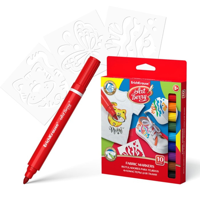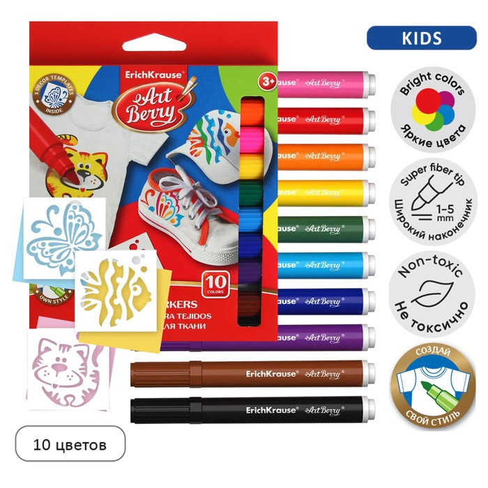 Набор для творчества ErichKrause ArtBerry, фломастеры для ткани 10 цветов + 3 трафарета, линия 1.0-7.0 мм