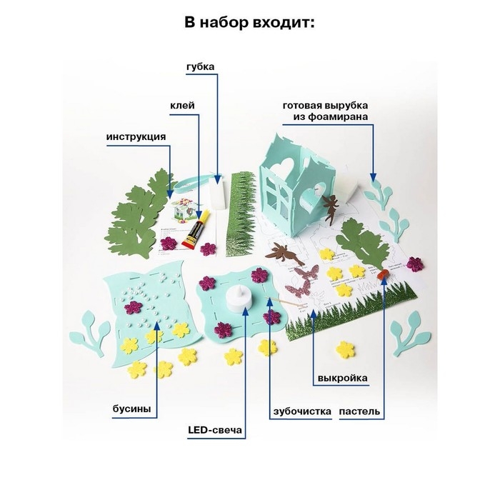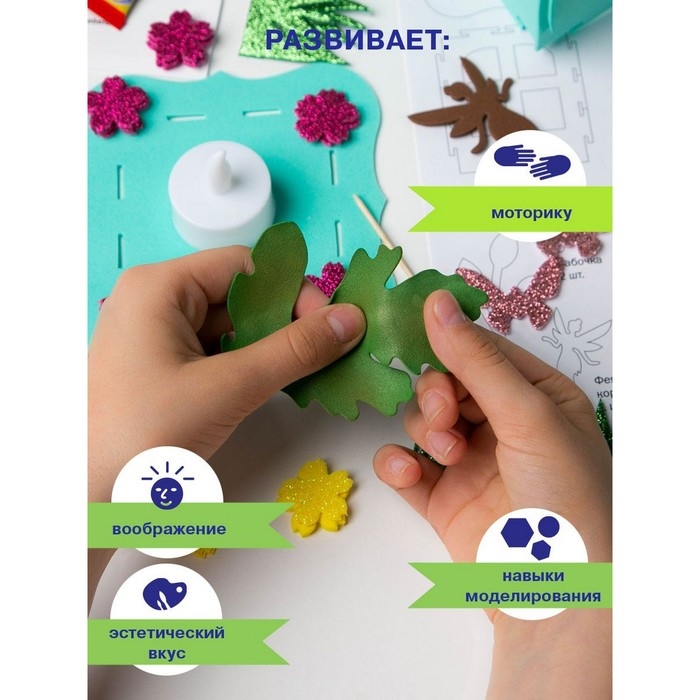 Набор для творчества «Украшение из фоамирана» поможет вам своими руками создать сказочный дом-фонарик. Его крыша состоит из цветов, а рядом с окнами летают маленькие феи. Используйте поделку в качестве ночника. В комплекте есть подробная инструкция, в которой пошагово показано, как сделать домик феи.