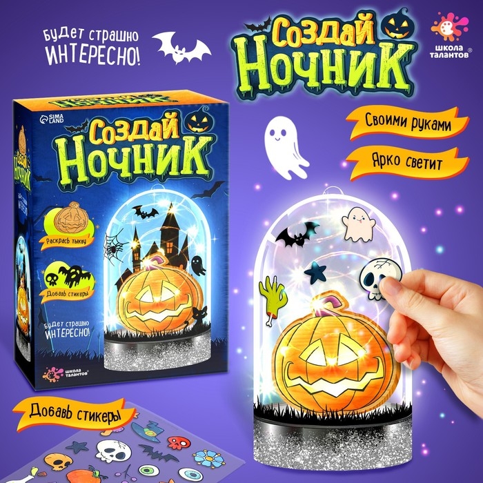 Набор для творчества «Ночник. Хэллоуин. Тыква» — защитник вашего ребёнка тёмной ночью, необычный декор детской комнаты, сделанный собственными руками и приятное воспоминание о совместном времяпрепровождении при его создании.