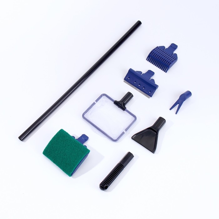 Набор инструментов для ухода за аквариумом включает в себя два скребка (мягкий и металлическое лезвие), сачок, насадки для грунта и растений, которые могут меняться на едином держателе по мере необходимости. Может иcпользоваться в пресной и соленой воде.