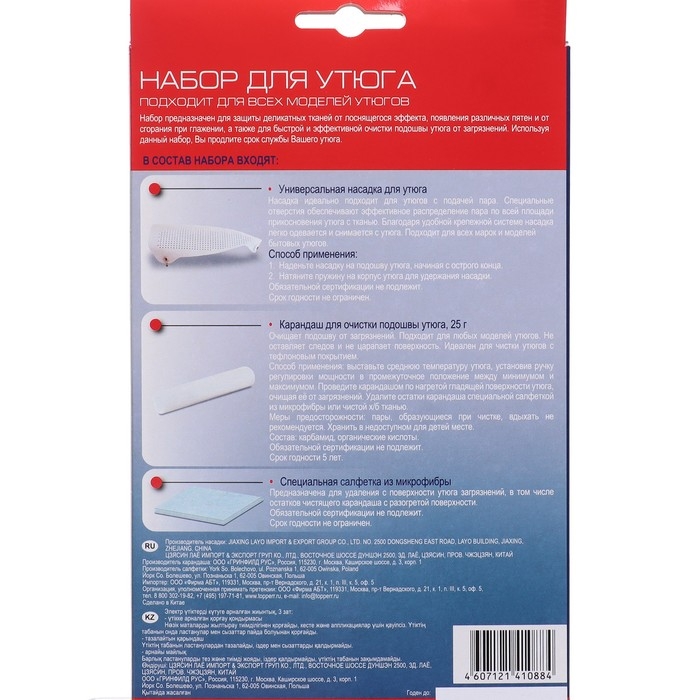В набор для утюга входит всё самое необходимое: защитная насадка, чистящий карандаш и специальная салфетка.