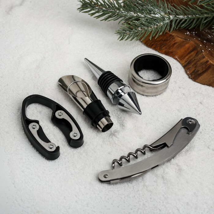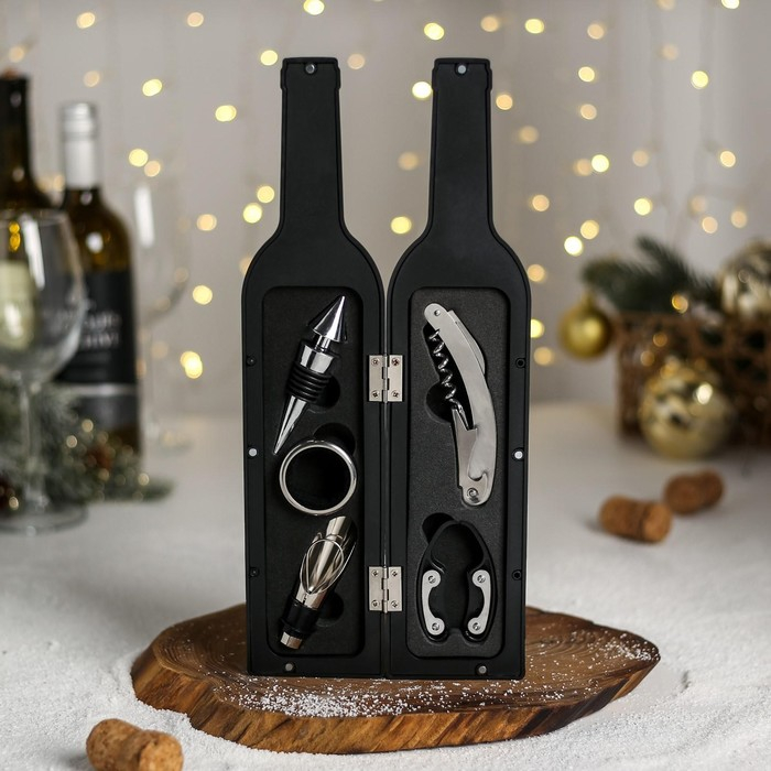 Набор станет отличным презентом для истинных ценителей вина. Идеальное сочетание необходимых приспособлений и необычный дизайн, отлично подойдет в качестве подарка к особенным торжествам или по другому поводу.