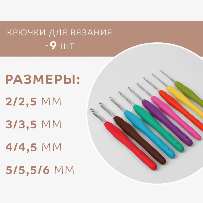 - Крючки для вязания - 9 шт (2 мм, 2,5 мм, 3 мм, 3,5 мм, 4 мм, 4,5 мм, 5 мм, 5,5 мм, 6 мм).